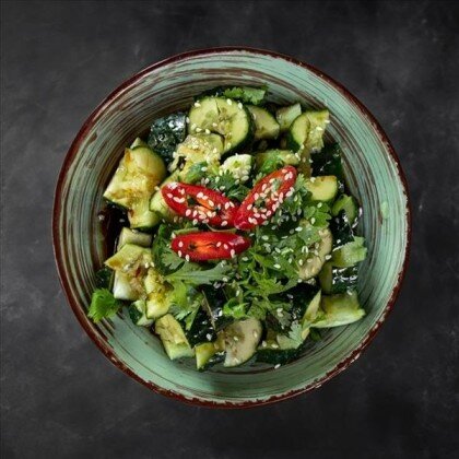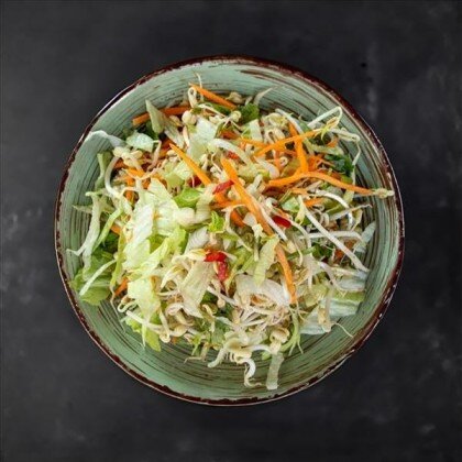 Теплый вьетнамский салат из обжаренной на воке говядины, лапшой Бун, свежего огурца, моркови, салата, ростками бобов, заправляется соусом «Ныок Мам», посыпается кинзой.
