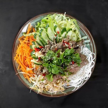 Вьетнамский салат из авокадо, свежего огурца, моркови, салата, ростками бобов, заправляется ореховым и манго соусом, посыпается кинзой.