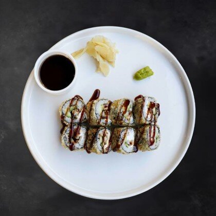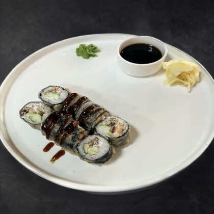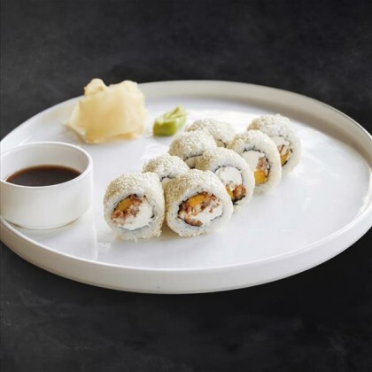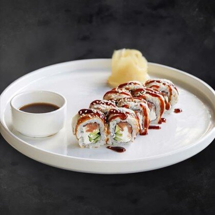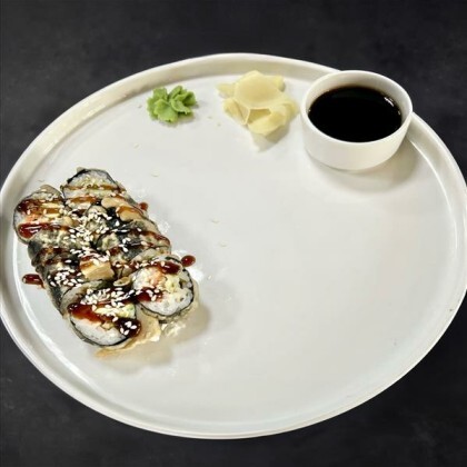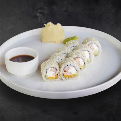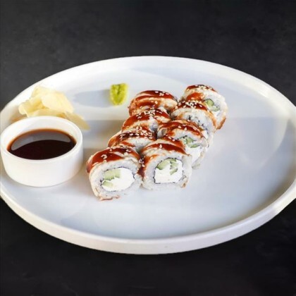 Угорь, креветки, рис, сливочный сыр, огурец, авокадо, унаги соус, манго чили соус, кунжут